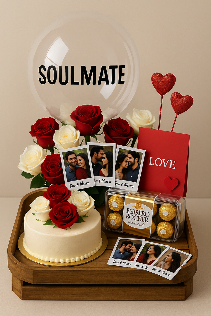 A romantic tray hamper with red and white roses, fresh cream cake, personalized couple photos, “Soulmate” balloon, Ferrero Rocher, and love card—ideal for celebrating your special bond on happyribbon.in