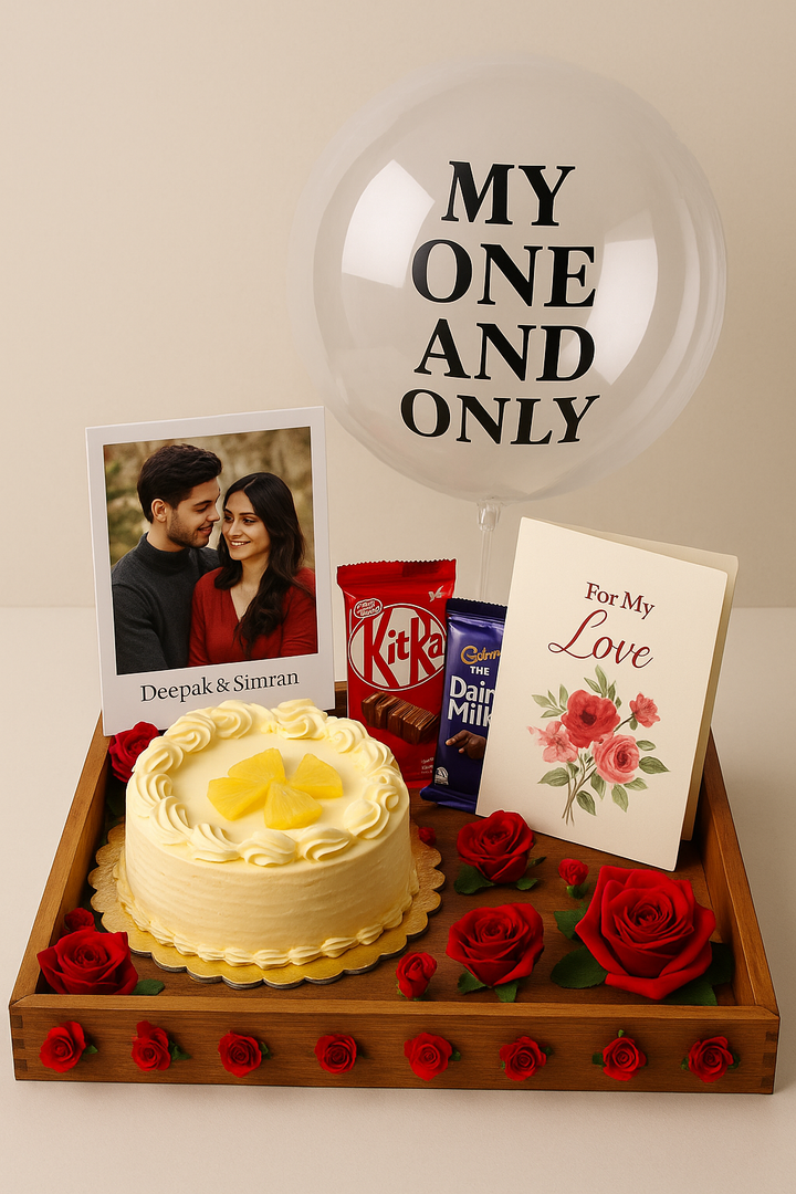 A romantic tray hamper with a pineapple cake, bunch of red roses, personalized couple photo, "My One And Only" balloon, For My Love greeting card, Dairy Milk, and KitKat—perfect for anniversaries, proposals, and celebrating your one true love from happyribbon.in
